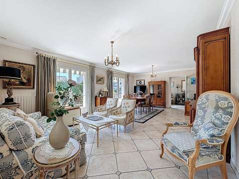 Le séjour, chaleureux et baigné de lumière grâce à de larges ouvertures sur le jardin, offre une atmosphère à la fois conviviale et élégante.