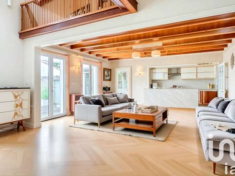 Dès l’entrée, vous serez séduit par un vaste séjour baigné de lumière, offrant une belle luminosité tout au long de la journée. Cet espace est sublimé par une belle hauteur sous plafond avec charpente apparente et un poêle à bois, créant une atmosphère chaleureuse et conviviale. La cuisine ouverte s’intègre harmonieusement à cet espace de vie, qui s’ouvre sur un charmant patio intimiste, pensé comme un véritable prolongement du séjour : un espace cocooning, idéal pour se détendre, lire ou partager des moments à l’abri des regards.