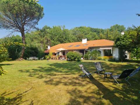 iad France - Romain Pichon vous propose : Seignosse, à 500 m du Lac marin et des Plages, Belle villa de plain-pied sur un jardin arboré et fleuri de 1140m2 environ piscinable. Son exposition SUD et OUEST lui attribue un bel ensoleillement et beaucoup de clarté. Au calme, sans vis à vis, et en parfait état, elle se compose d'une entrée avec placard, d'un séjour salon avec cheminée et ouvrant sur de belles terrasses. 1 cuisine aménagée donnant sur 1 jolie patio prolongé d'une terrasse.