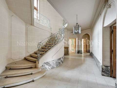 Dès l’entrée, le ton est donné : un majestueux hall en pierre naturelle avec rampe en fer forgé dessert les espaces de réception du rez-de-chaussée, comprenant :