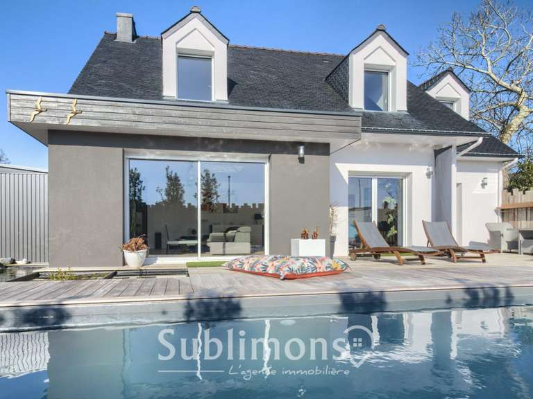 Demeures Marines vous présente « Canopée », une maison d’architecte avec maison d’amis, nichée dans un environnement intime et préservé, entre le bourg et la pointe d’Arradon, au cœur du Golfe du Morbihan.