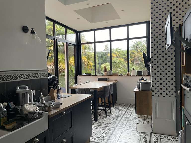 Dès l’entrée, la lumière s’impose comme un fil conducteur. La pièce principale, d’une superficie remarquable de 63 m2, offre une expérience de vie unique. En son cœur, une cheminée insert à trois faces vitrées, réalisée par Gilles Heissat à Cesson-Sévigné, structure les espaces avec élégance et crée une atmosphère chaleureuse et contemporaine. La verrière signée Beaugendre à Acigné vient subtilement rythmer les volumes, tandis que la cuisine, entièrement conçue par le cuisiniste Chauvin à Janzé, s’inscrit dans une esthétique à la fois épurée et hautement fonctionnelle. Une arrière-cuisine aménagée prolonge cet ensemble avec discrétion.