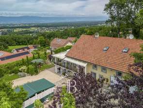 À seulement 2 km de la frontière suisse, dans un environnement calme et préservé, cette ancienne ferme vaudoise construite entre 1873 et 1875 séduit dès les premiers instants par son authenticité et son caractère unique.Rénovée avec soin il y a une trentaine d’années, elleincarne l’équilibre parfait entre le charme de l’ancien et le confort contemporain. Nichée à 600 mètres d’altitude, elle offre un panorama exceptionnel à 180° sur le bassin genevois et le lac Léman, véritable tableau vivant à admirer au fil des saisons.Au cœur d’un terrain de 3 100 m² en zone constructible — une opportunité rare pour ceux qui souhaitent imaginer d’autres projets — la maison s’ouvre sur de beaux volumes baignés de lumière. Dès l’entrée, l’atmosphère est chaleureuse, empreinte d’histoire et d’élégance discrète. Les espaces de vie s’articulent autour d’une magnifique véranda, véritable poste d’observation sur la nature environnante, tandis que les chambres invitent à la sérénité, chacune avec son ambiance propre.La suite parentale, avec son dressing, sa salle de bains et son sauna, est un havre de calme. Un grand espace bureau permet d’envisager une activité professionnelle ou artistique à domicile, dans un cadre inspirant. Les combles, eux, attendent vos projets pour se transformer selon vos envies.À l’extérieur, la propriété entièrement close propose garages, parkings, […] Voir l’annonce immobilière >>
