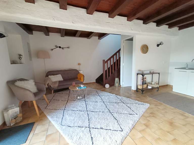 RDC : Salon - séjour lumineux ouvrant sur une terrasse en bois exposée sud-ouest sans vis à vis, cuisine semi-ouverte, aménagée et équipée, suite parentale, WC, garage avec porte motorisée.