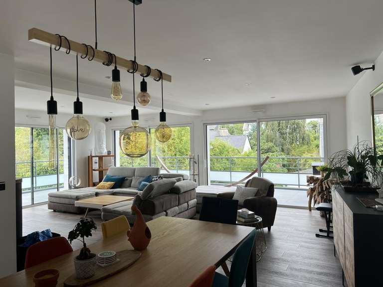 LARMOR -PLAGE - Quartier recherché, le bourg et les plage à pieds. Beaux volumes pour cette maison lumineuse de 215m2, avec vie totale au RDC. Elle se compose d'une cuisine A+E ouverte sur salon séjour avec poêle à bois et donnant sur terrasse, suite parentale avec placard et SDD (douche italienne), WC. A l'étage, mezzanine, 2 CH., SDD. En rez de jardin, une grande pièce de vie, CH. avec étagères-penderie et SDD, WC, cuisine d’été. Piscine, grand carport double. Maison rénovée totalement avec création d'une extension en 2019. DPE : C.