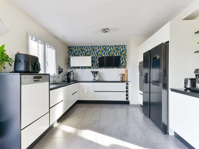 offre de beaux volumes et une luminosité remarquable. Entièrement rénovée, elle propose au rez-de-chaussée une cuisine moderne aménagée et équipée, ouverte sur un salon chaleureux, ainsi qu'un bureau, une buanderie et un WC.