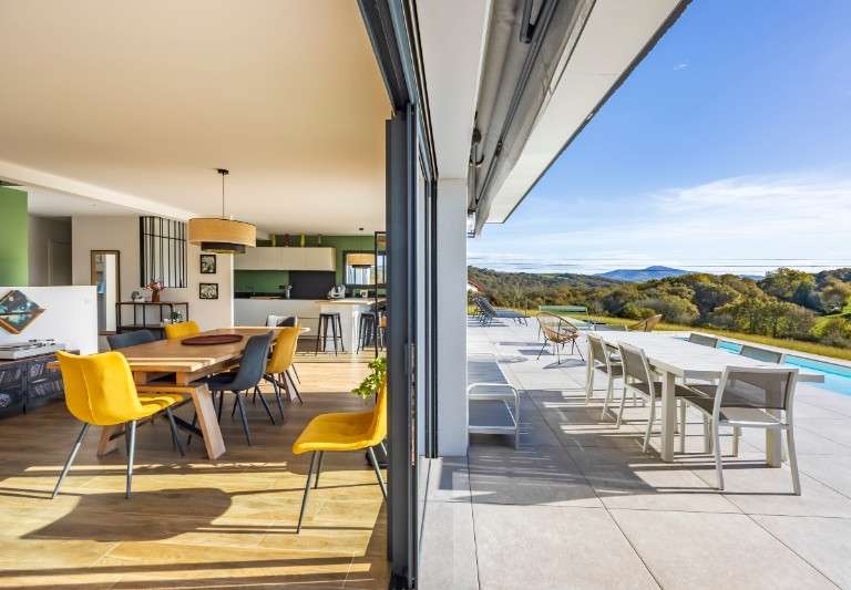 Nichée à cheval sur les communes de Mouguerre et Villefranque, cette demeure profite d’un environnement privilégié : entourée de plusieurs centaines d’hectares de nature préservée, protégée de toute pression immobilière, tout en restant à quelques minutes seulement des axes rapides, de la gare, de l’aéroport et des plages de la Côte Basque.