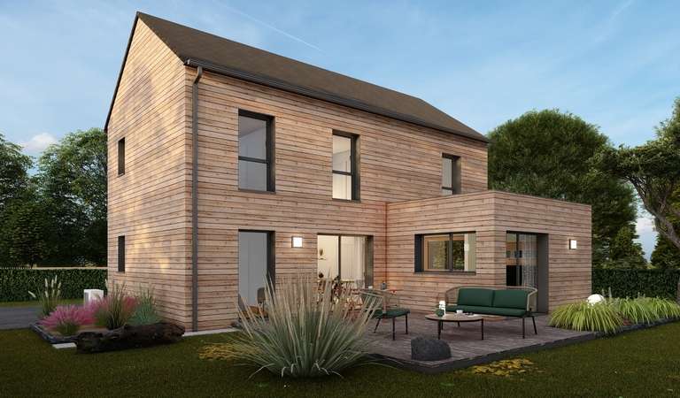Nouveau lotissement à PLOUNEVEZ MOEDEC terrain en lotissement de 442M2 borné et viabilisé à proximité immédiate du coeur de bourg dans un environnement calme et préservé idéal pour un projet de construction avec TRECOBOIS la maison bas carbone Maison ossature bois Bardage Douglas naturel, maison étage de 126m2 toiture ardoisée, comprenant cuisine ouverte sur séjour, 4 chambres, 2 salles d'eau, cellier.Pompe à chaleur Panasonic, VMC Renson, Maison connectée par Schneider, bas carbone RE2020.