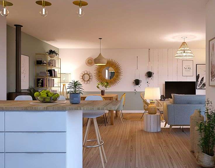 L'agencement intérieur a été étudié avec attention afin de proposer des volumes équilibrés et une circulation agréable. Le logement comprend une entrée, un séjour lumineux avec cuisine ouverte, idéal pour partager des moments conviviaux dans un espace de vie moderne et chaleureux.