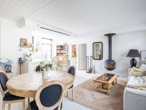 Un bel espace de vie de 55 m², ouvert sur terrasse et jardin, lumineux par ses nombreuses ouvertures, accueille un espace dînatoire et sa cuisine aménagée ouverte, un coin détente devant le poêle à bois et un salon.