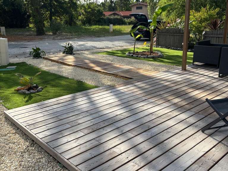 iad France - Jean-Luc Gibert vous propose: Terrain en drapeau de 473m2 côté bassin à Saint Brice.En zone UC avec une emprise possible de 30% .Piscine ( Coque Waterair) et abri à supprimer.