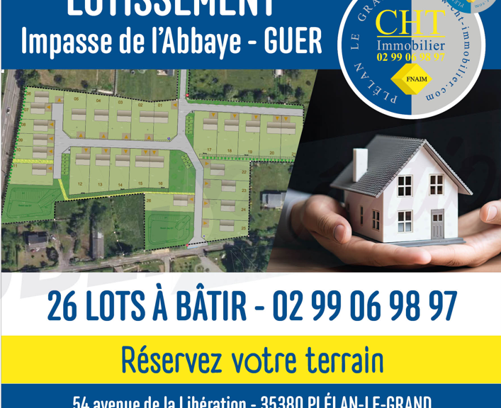 CHT IMMOBILIER vous propose de réaliser votre construction sur un terrain viabilisé de 463m2. Ce terrain se situe en lotissement, à proximité du centre ville de GUER, avec commerces, écoles et activités à proximité immédiate. Ce terrain est implanté au sein d'un lotissement de 26 lots, sur les hauteurs de GUER avec vue dégagée. Libre de constructeur, vous pourrez réaliser le projet qui vous convient. Découvrez également d'autres terrains entre 241m2 et 546m2. La commune de GUER est très dynamique, elle compte un peu moins de 7 000 habitants et accueille tous types de commerces (Boulangeries, Boucheries, Epicerie, Supermarché, Magasin de bricolage et de vêtements, Opticien...) un centre médical et deux pharmacies, et les écoles du primaire au lycée. Le milieu associatif est très développé, vous y trouverez à coup sûr votre activité en fonction de vos centres d'intérêts. Contactez vite CHT IMMOBILIER pour réserver votre terrain.