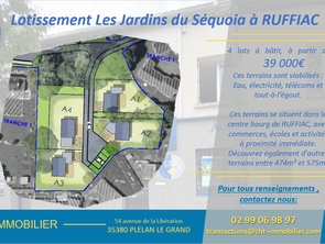 CHT IMMOBILIER vous propose de réaliser votre construction sur un terrain viabilisé de 474m2, à seulement 8 km de MALESTROIT et 15 km de PLOERMEL. Ce terrain se situe en lotissement, dans le centre bourg de RUFFIAC, avec commerces, écoles et activités à proximité immédiate. Ce terrain est implanté au sein d'un lotissement de 5 lots. Libre de constructeur, vous pourrez réaliser le projet qui vous convient. Découvrez également d'autres terrains entre 474m2 et 575m2. RUFFIAC est une charmante, qui accueille tous types de commerces (Boulangeries, Boucheries, Epicerie, Pharmacie, une maison de santé, Coiffeurs, ...) et les écoles du primaire. Le milieu associatif est très développé, vous y trouverez à coup sûr votre activité en fonction de vos centres d'intérêts. Contactez vite CHT IMMOBILIER pour réserver votre terrain. Les informations sur les risques auxquels ce bien est exposé sont disponibles sur le site Géorisques : www.georisques.gouv.fr Vous avez un projet immobilier sur le secteur de Brocéliande ? Pour vendre, acheter ou louer une maison à Plélan le Grand, Guer, Beignon, Saint Malo de Beignon, Porcaro, Augan, Monteneuf, Concoret, Campénéac, Paimpont, Saint Péran, […] Voir l’annonce immobilière >>